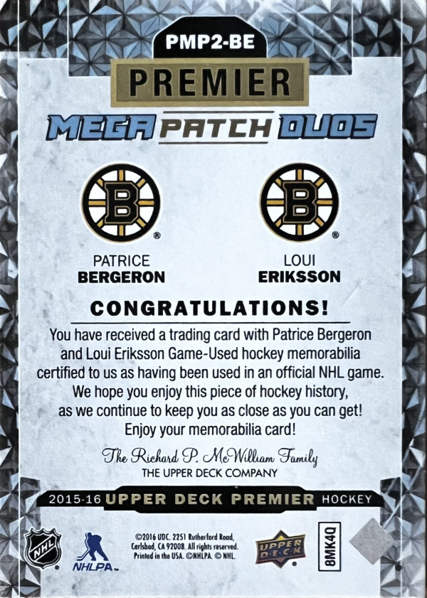 2015-16 UD Premier Mega Patch Duos /25, Patrice Bergeron / Loui Eriksson