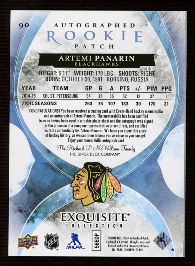 2015-16 Upper Deck The Cup - Exquisite ROOKIE PATCH AUTO RPA TO JERSEY NUMBER /72 ON CARD AUTOGRAPH Blackhawks THE BREADMAN