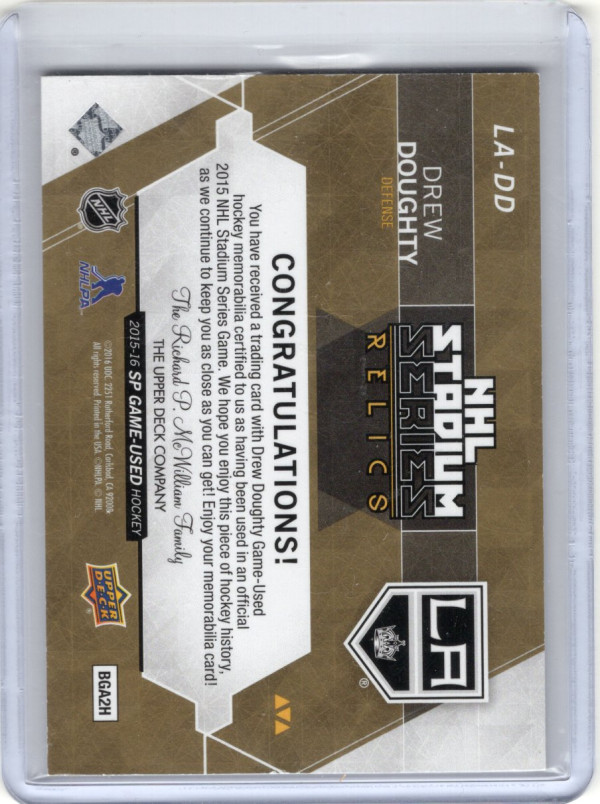 You are purchasing a 2015 Upper Deck SP Game Used NHL Stadium Series Relics Drew Doughty #LA-DD 23/49 Game Used Jersey. You will receive the exact item in the photographs. Thank you for looking.