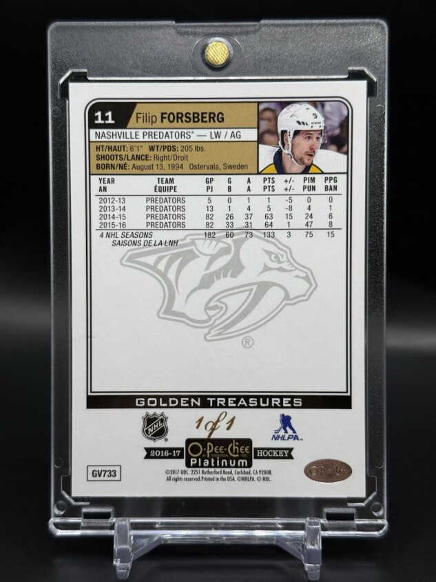 You are purchasing a 2016-17 O-Pee-Chee Platinum Filip Forsberg #11 Golden One of One. You will receive the exact item in the photographs. Thank you for looking.