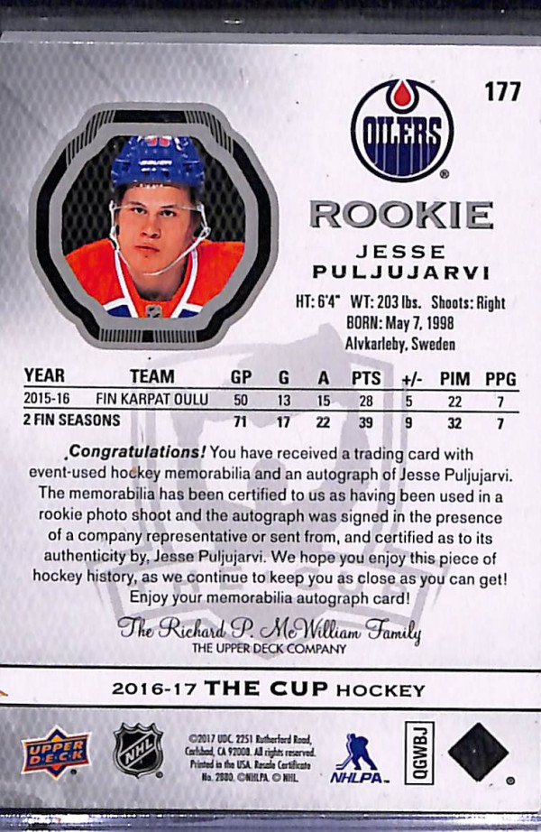 You are purchasing a 2016-17 Upper Deck The Cup Jesse Puljujarvi #177. You will receive the exact card in the photographs. Thank you for looking.