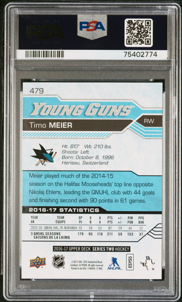 You are purchasing a 2016 Upper Deck Timo Meier #479 UD Exclusives PSA 9. You will receive the exact card in the photographs. Thank you for looking. Jersey number.