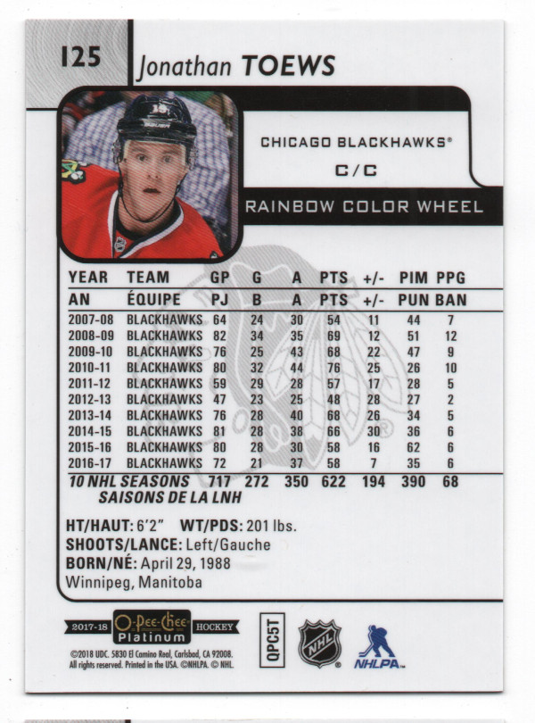 2017-18 O-Pee-Chee Platinum ePack Rainbow Color Wheel Parallel #125 Jonathan Toews