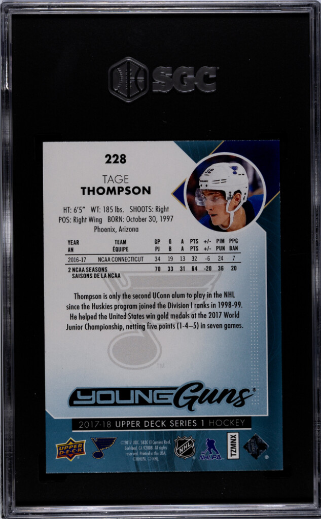 You are purchasing a 2017-18 Upper Deck Tage Thompson #228 Young Guns Rookie SGC 10. You will receive the exact item in the photographs. Thank you for looking.