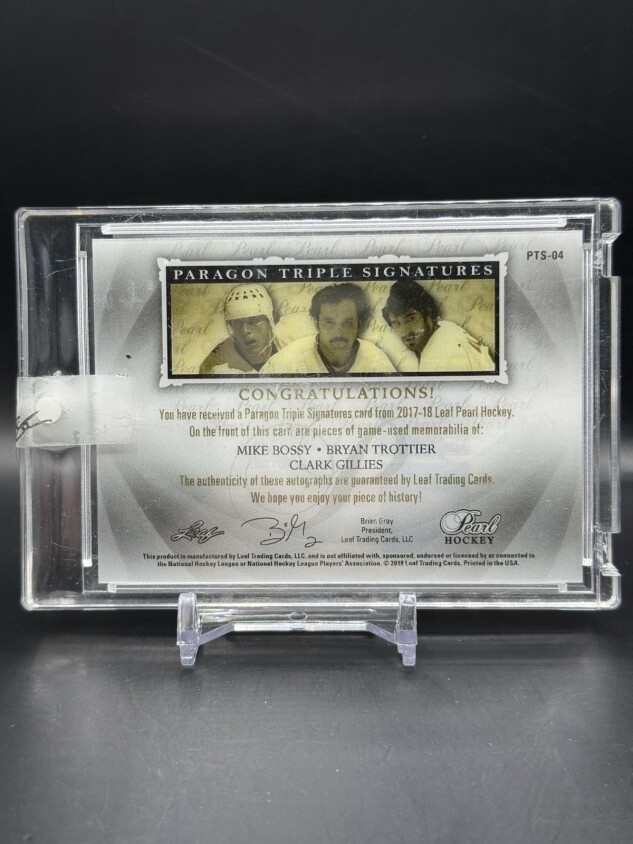 You are purchasing a 2017-18 Leaf Pearl Clark Gillies Bryan Trottier Mike Bossy Patch. You will receive the exact item in the photographs. Thank you for looking.