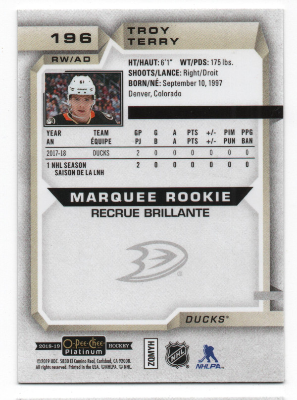 2018-19 O-Pee-Chee Platinum #196 Troy Terry RC