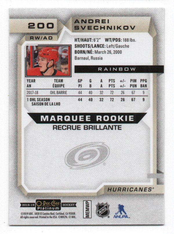2018-19 O-Pee-Chee Platinum Rainbow Parallel #200 Andrei Svechnikov RC