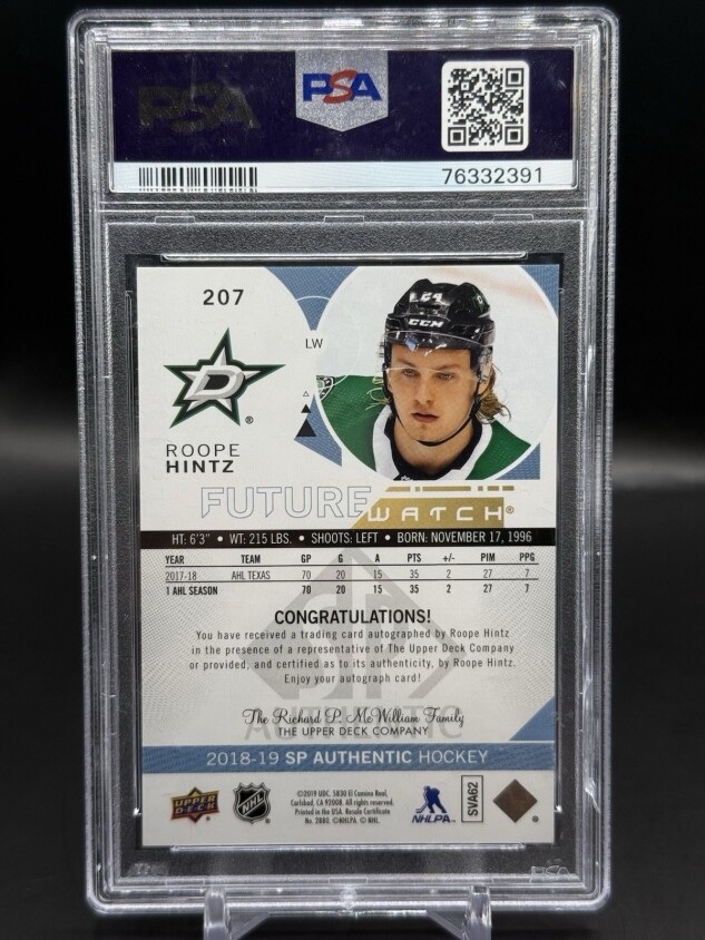 You are purchasing a 2018-19 SP Authentic Roope Hintz #207 Autograph Inscription Short Print PSA 10 Auto 10. You will receive the exact item in the photographs. Thank you for looking.