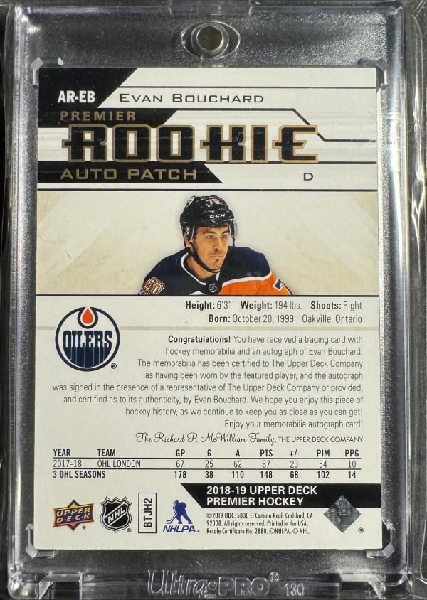 2018-19 Upper Deck Premier Evan Bouchard Rookie Auto Patch-Gold /99