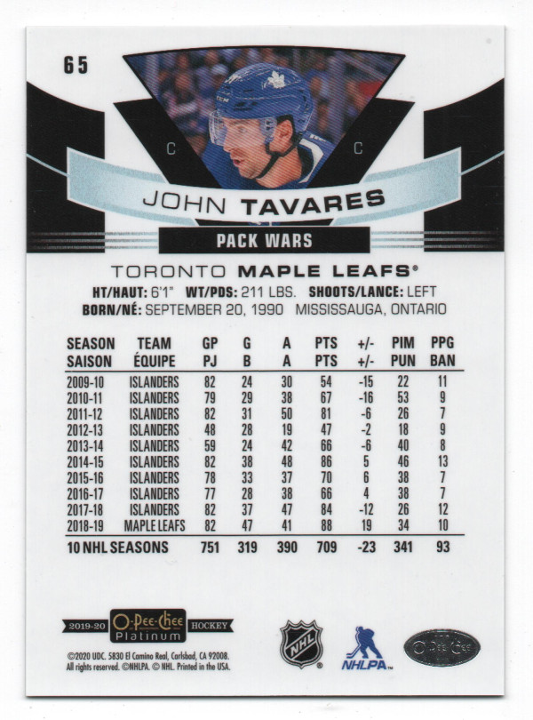 2019-20 O-Pee-Chee Platinum Pond Hockey ePack Green Parallel #65 John Tavares
