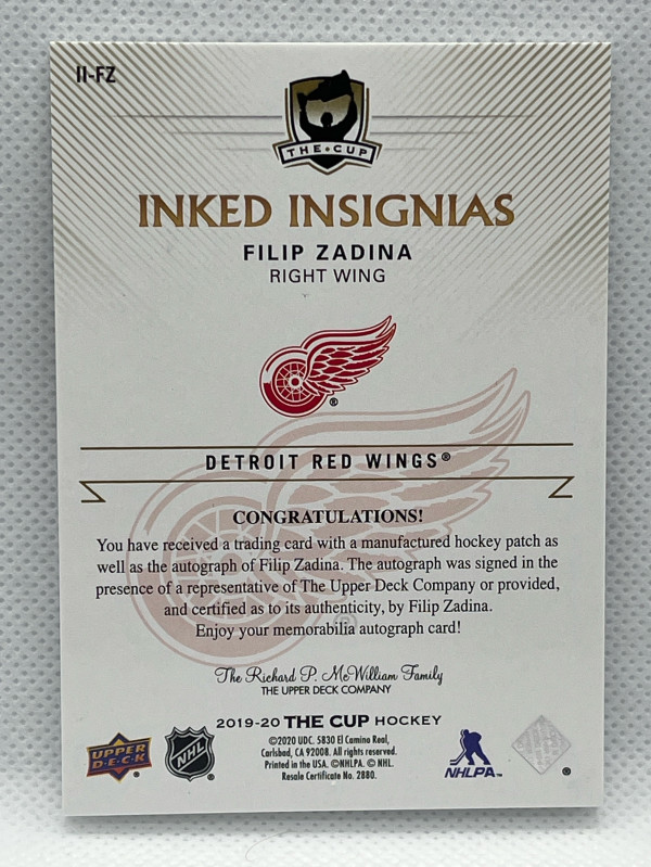 2019-20 The Cup FILIP ZADINA #II-FZ Inked Insignia Patch Auto 14/75