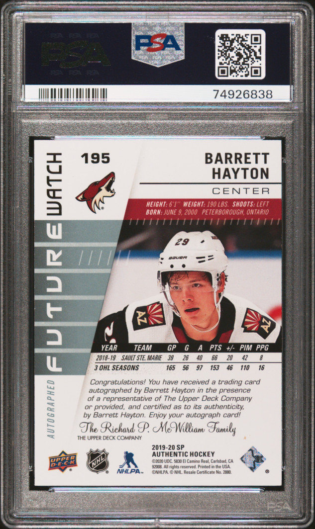 You are purchasing a 2019 SP Authentic Barrett Hayton #195 PSA 9. You will receive the exact card in the photographs. Thank you for looking.