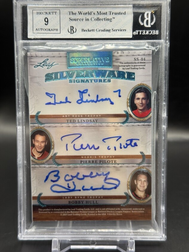 You are purchasing a 2020-21 Leaf Superlative Ted Lindsay Bobby Hull Martin Brodeur Gordie Howe Pilote Mario Lemieux #SS-04 Signatures Short Print BGS 7.5 Auto 9. You will receive the exact item in the photographs. Thank you for looking.