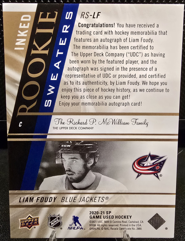 2020-21 SP Game Used Rookie Sweaters Inked /49 Liam Foudy #RS-LF RPA Blue Jackets