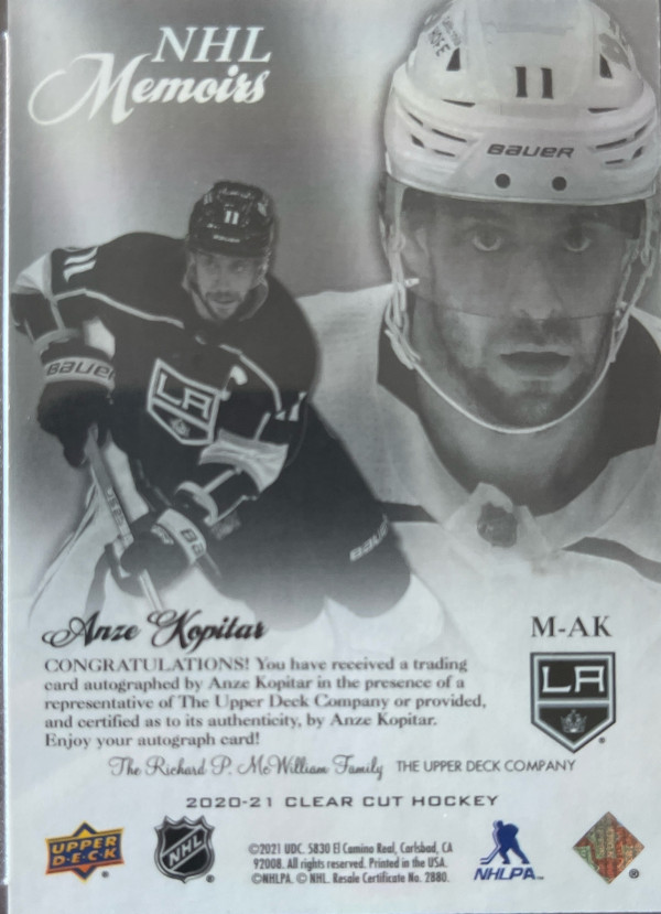 2020–21 Upper Deck NHL Memoirs Anze Kopitar Clear Cut Autograph