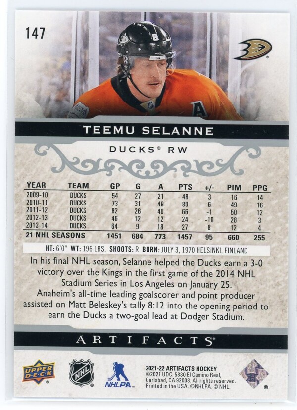 2021-22 Artifacts #147 Teemu Selanne /599