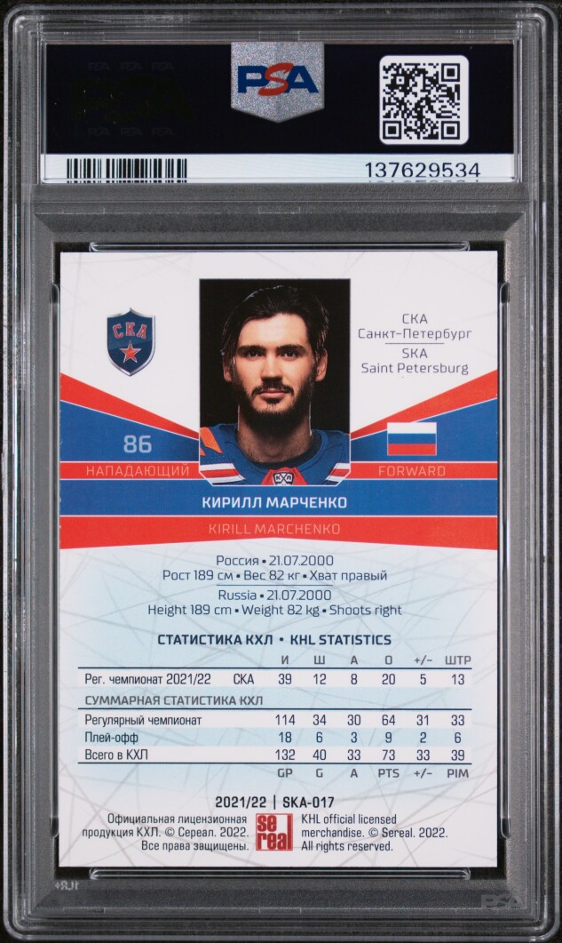 You are purchasing a 2021-22 Sereal KHL The 14th Season Collection Kirill Marchenko #SKA017 Rookie PSA 10. You will receive the exact item in the photographs. Thank you for looking.