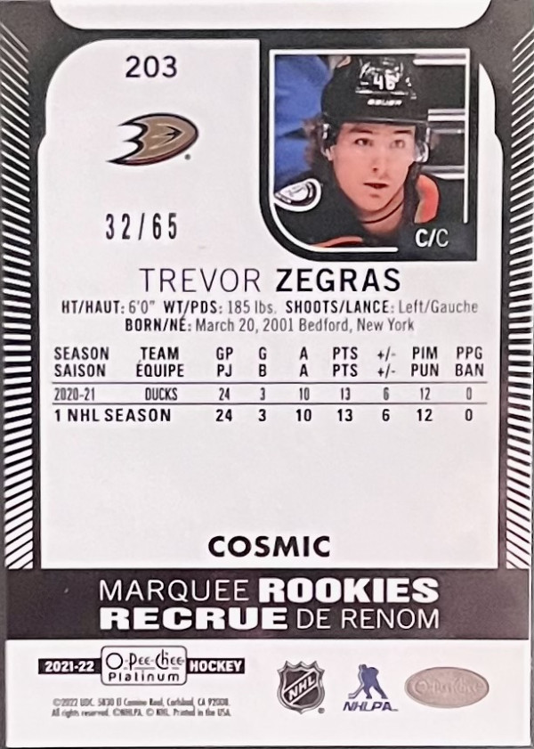 2021-22 Trevor zegras cosmic opc platinum rookie
