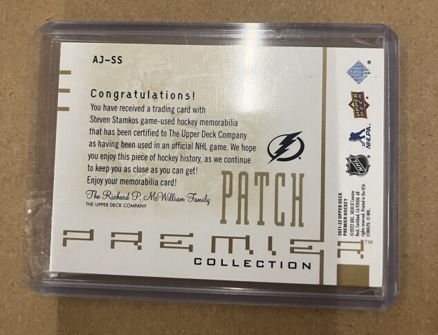 You are purchasing a 2021-22 Upper Deck Premier Steven Stamkos #AJ-SS Patch Game Used Patch Memorabilia. You will receive the exact item in the photographs. Thank you for looking.