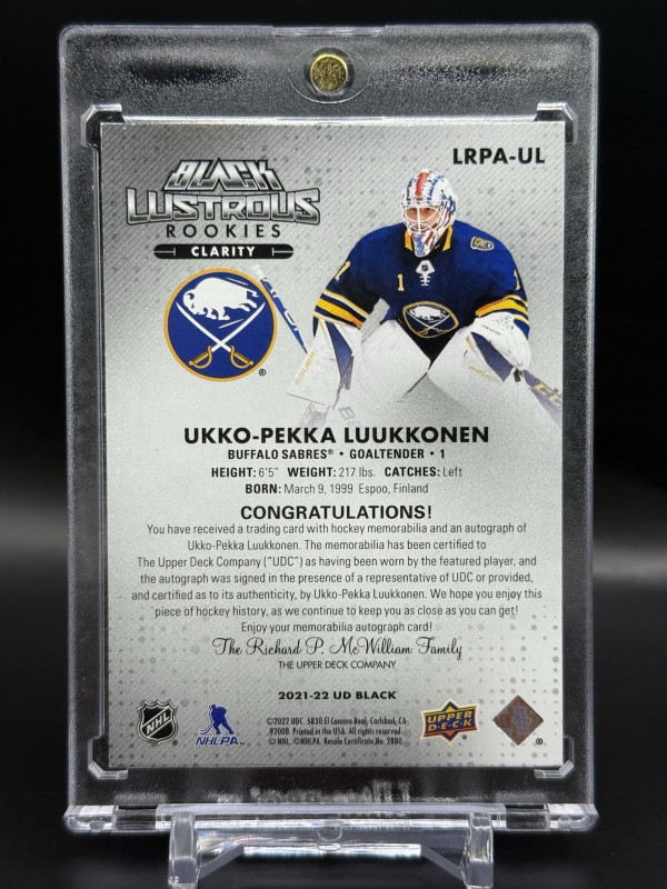 2021-22 UD SPX Ukko-Pekka Luukkonen Black Lustrous Rookie Patch Auto Clarity /15