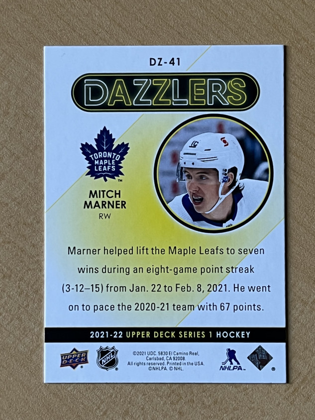 You are purchasing a 2021-22 Upper Deck Dazzlers Orange #DZ-41 Mitch Marner —VVCARDS—I do my best to assess the condition of the card and describe it accurately. Please review the pictures in the listing for condition as this is the exact card you will receive. The card is located in Canada and will be shipped using Canada Post. Thank you for looking.