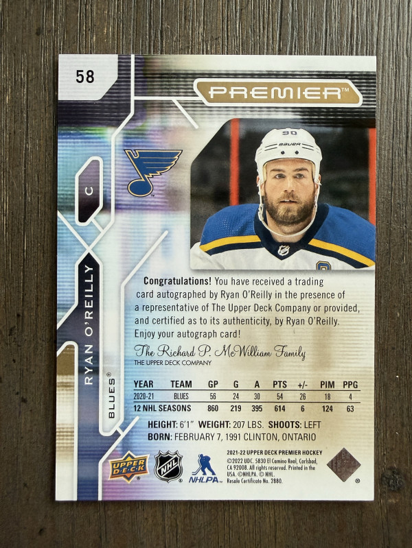 2021-22 Upper Deck Premier Ryan O’Reilly Base Gold Auto /25 #58