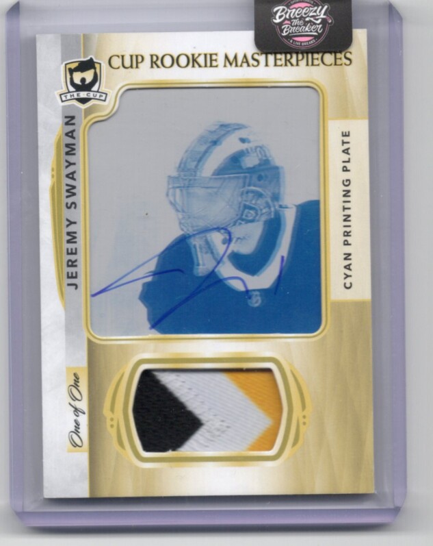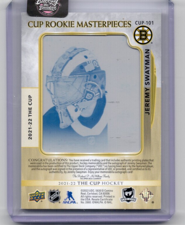 2021-22 Upper Deck The Cup Jeremy Swayman Rookie Printing Plate Patch Auto 1/1