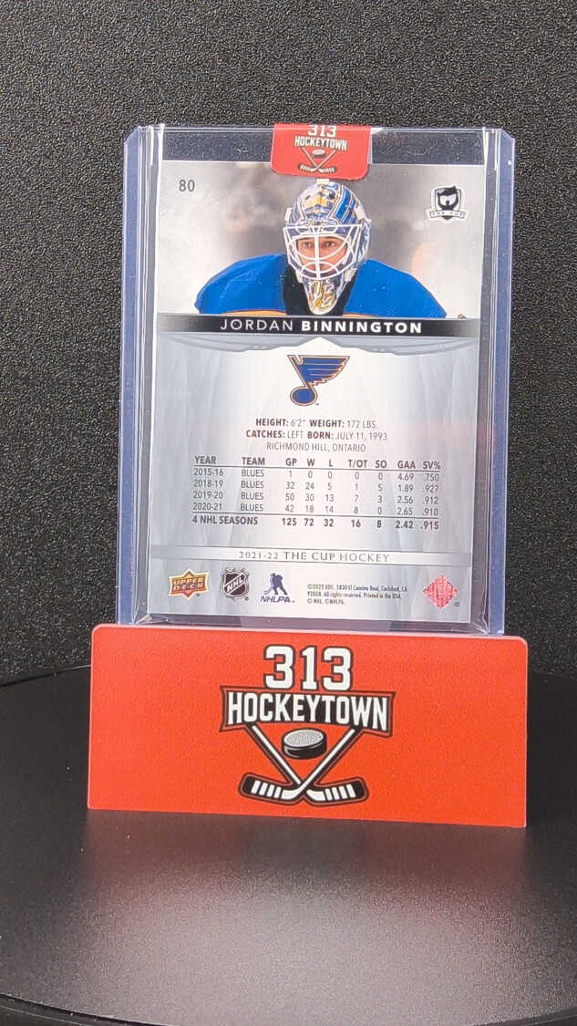 You are purchasing a 2021-22 Upper Deck The Cup Jordan Binnington #80. You will receive the exact item in the photographs. Thank you for looking.