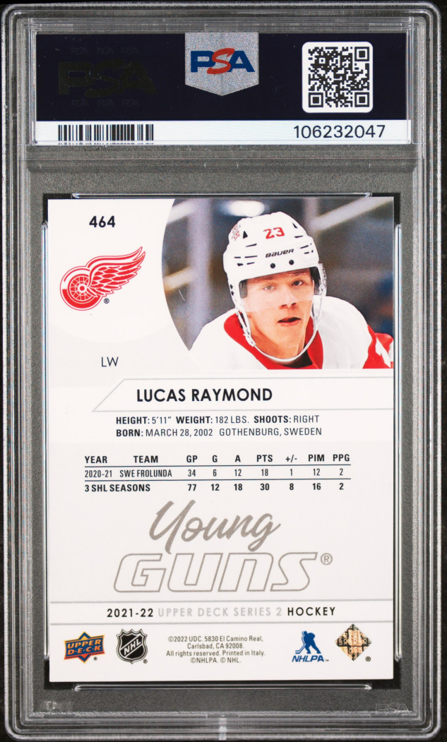 2021-22 Upper Deck Young Guns #464 Lucas Raymond Detroit Red Wings PSA 10 Rookie