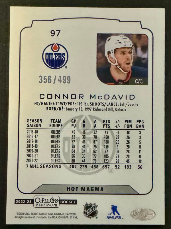 2022-23 O-Pee-Chee Platinum Connor McDavid Hot Magma /499