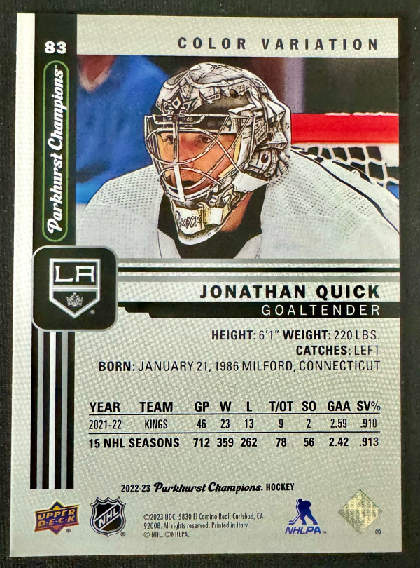2022-23 Parkhurst Champions Jonathan Quick Color Variation