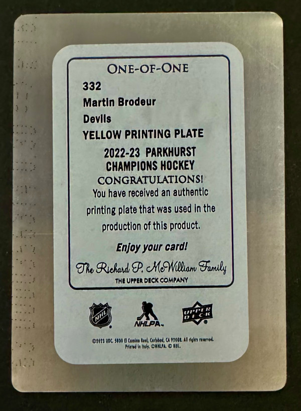 2022-23 Parkhurst Champions Martin Brodeur Legend Yellow Printing Plate 1/1