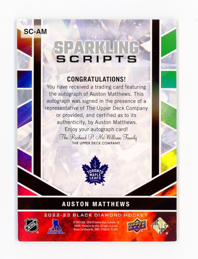 2022-23 UD Black Diamond AUSTON MATTHEWS Rare AUTO AUTOGRAPH #SC-AM Sparkling Scripts Toronto Maple Leafs