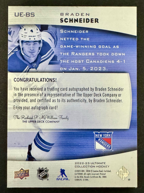 2022-23 Ultimate Collection Braden Schneider Ultimate Rookies Gold Ink Auto