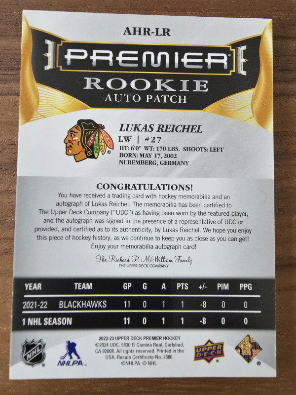 2022-23 Upper Deck Premier #AHR-LR Lukas Reichel Acetate Rookie Auto Patch 09/99
