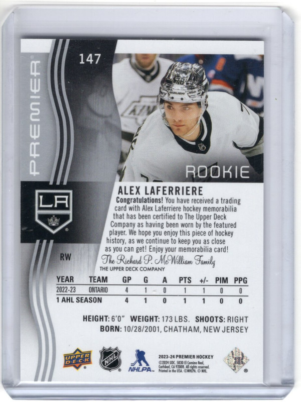 You are purchasing a 2022-23 Upper Deck Premier Alex Laferriere #147 Rookie Jersey Patch. You will receive the exact item in the photographs. Thank you for looking.