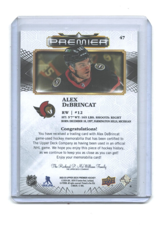You are purchasing a 2024 2022-23 Upper Deck Premier Alex DeBrincat #47 Jersey Parallel/Variety Memorabilia. You will receive the exact item in the photographs. Thank you for looking.