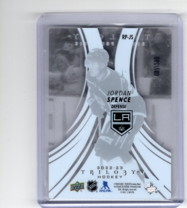 You are purchasing a 2022-23 Upper Deck Trilogy Jordan Spence #RP-JS Rookie 097/299. You will receive the exact item in the photographs. Thank you for looking.