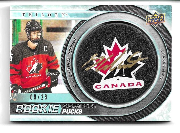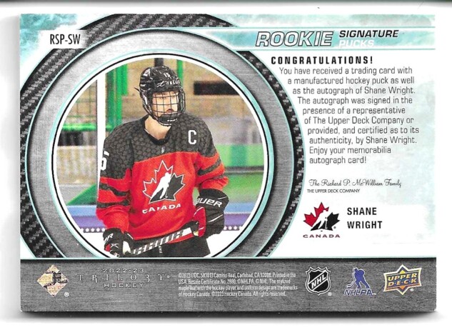 2022-23 UPPER DECK TRILOGY ROOKIE SIGNATURE PUCKS TEAM LOGO #RSP-SW SHANE WRIGHT (#09/23)