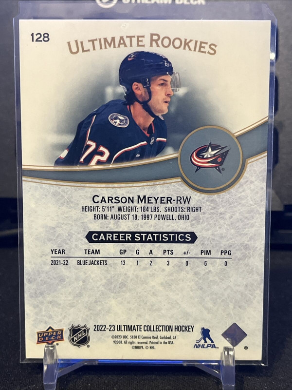 This 2022-23 Upper Deck Ultimate Collection sports trading card features rookie Carson Meyer of the Columbus Blue Jackets. The card is made of high-quality card stock and is part of the Ultimate Rookies insert set. It is #128 of the set, and is serial numbered 054/299.