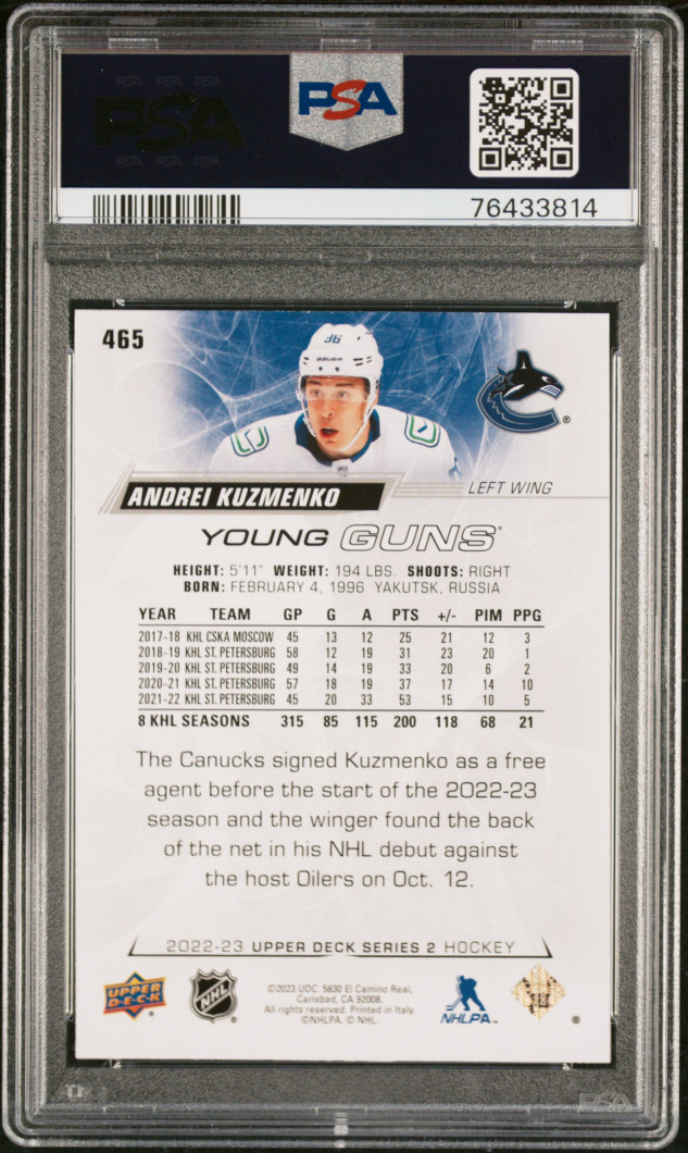 2022-23 Upper Deck Young Guns Andrei Kuzmenko Rookie RC #465 PSA 9 MINT Canucks