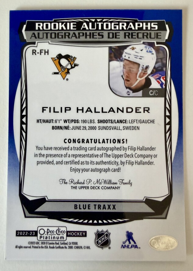 You are purchasing a 2022 O-Pee-Chee Platinum Filip Hallander Blue Traxx Rookie. You will receive the exact item in the photographs. Thank you for looking.
