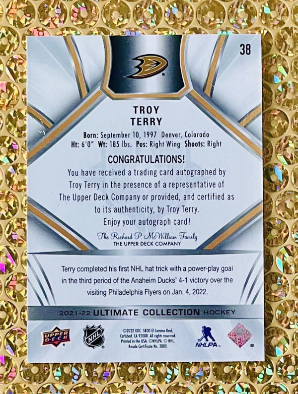 2022 UD Ultimate Collection #38 Troy Terry Silver Auto Anaheim Ducks