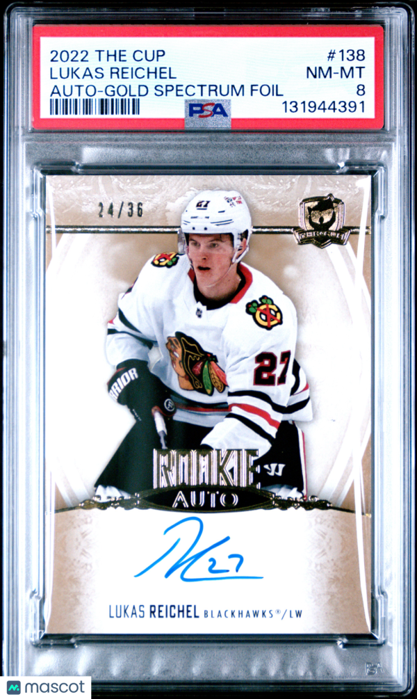 You are purchasing a 2022 Upper Deck The Cup Lukas Reichel #138 Auto Gold Spectrum Foil 24/36 PSA 8. You will receive the exact item in the photographs. Thank you for looking.