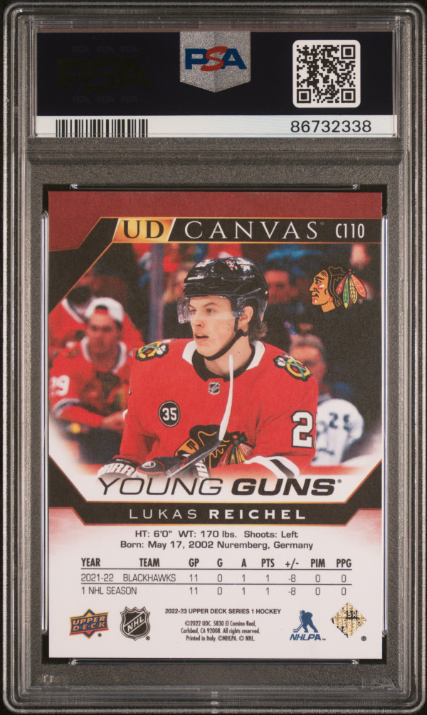 You are purchasing a 2022 Upper Deck UD Canvas Lukas Reichel #C110 PSA 10. You will receive the exact item in the photographs. Thank you for looking.