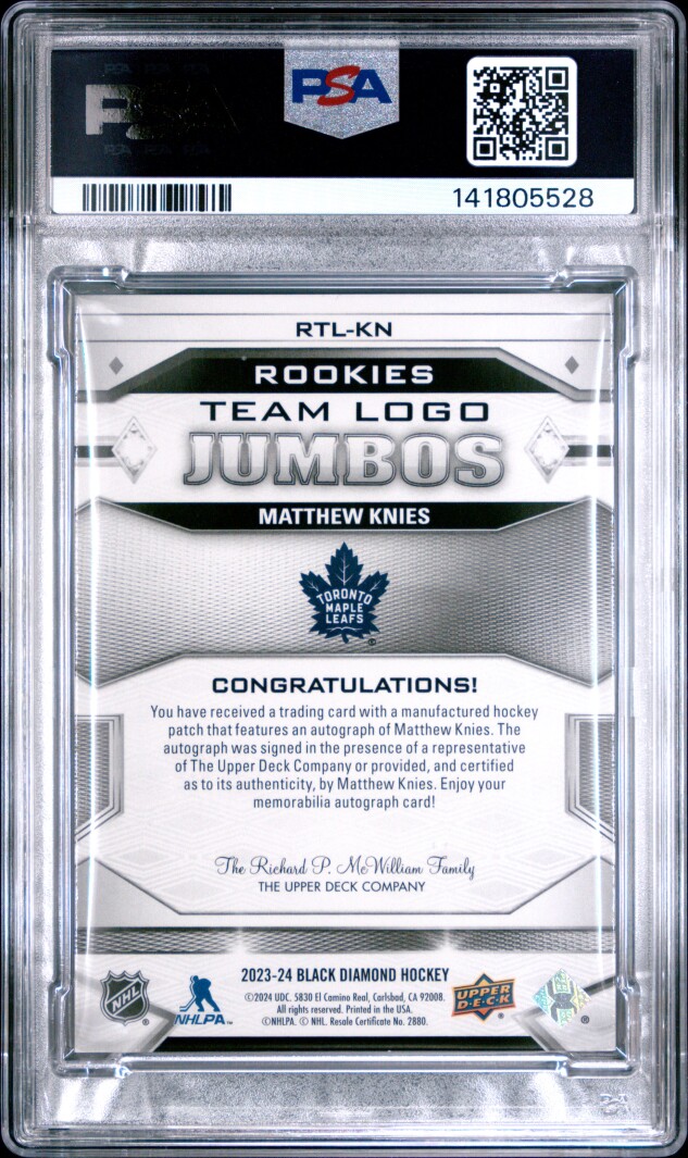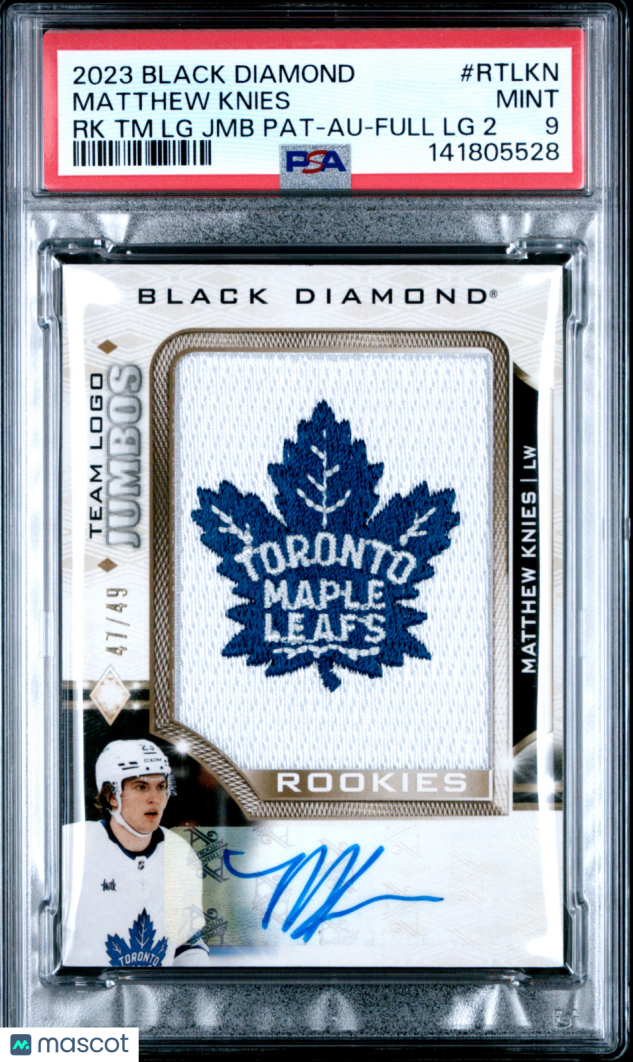 You are purchasing a 2023-24 Upper Deck Black Diamond Rookie Team Logo Jumbo Patches Matthew Knies #RTLKN Rookie 47/49 PSA 9. You will receive the exact item in the photographs. Thank you for looking.