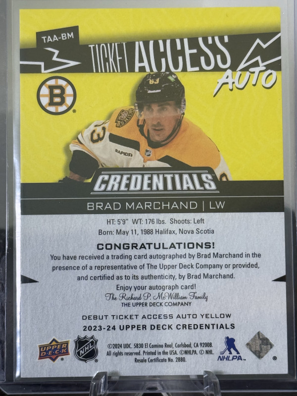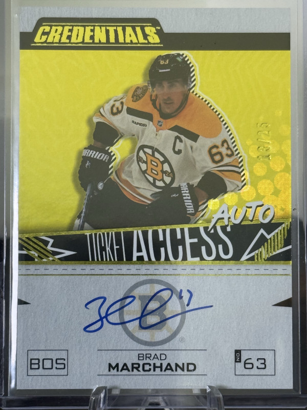 2023-24 Credentials Brad Marchand Ticket Access Auto Yellow /25