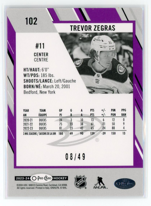 2023-24 O-Pee-Chee #102 Trevor Zegras Purple 8/49