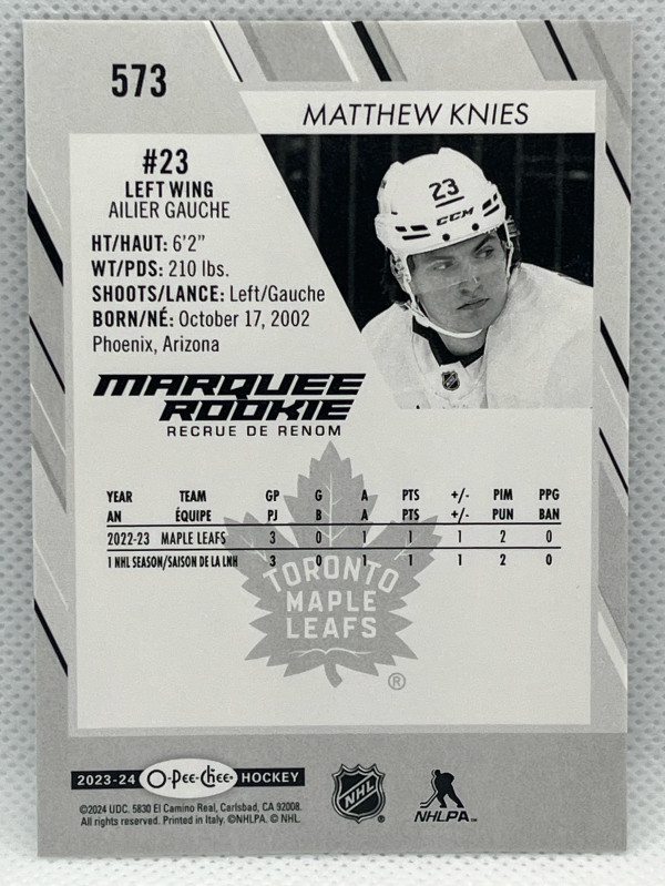 SUPER RARE!! 2023-24 OPC MATTHEW KNIES Marquee Rookie #573 PHOTO VARIANT SSP