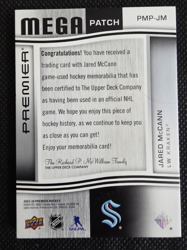 2023-24 Premier Mega Patch Chest Logo #PMP-MJ Jared McCann 11/28